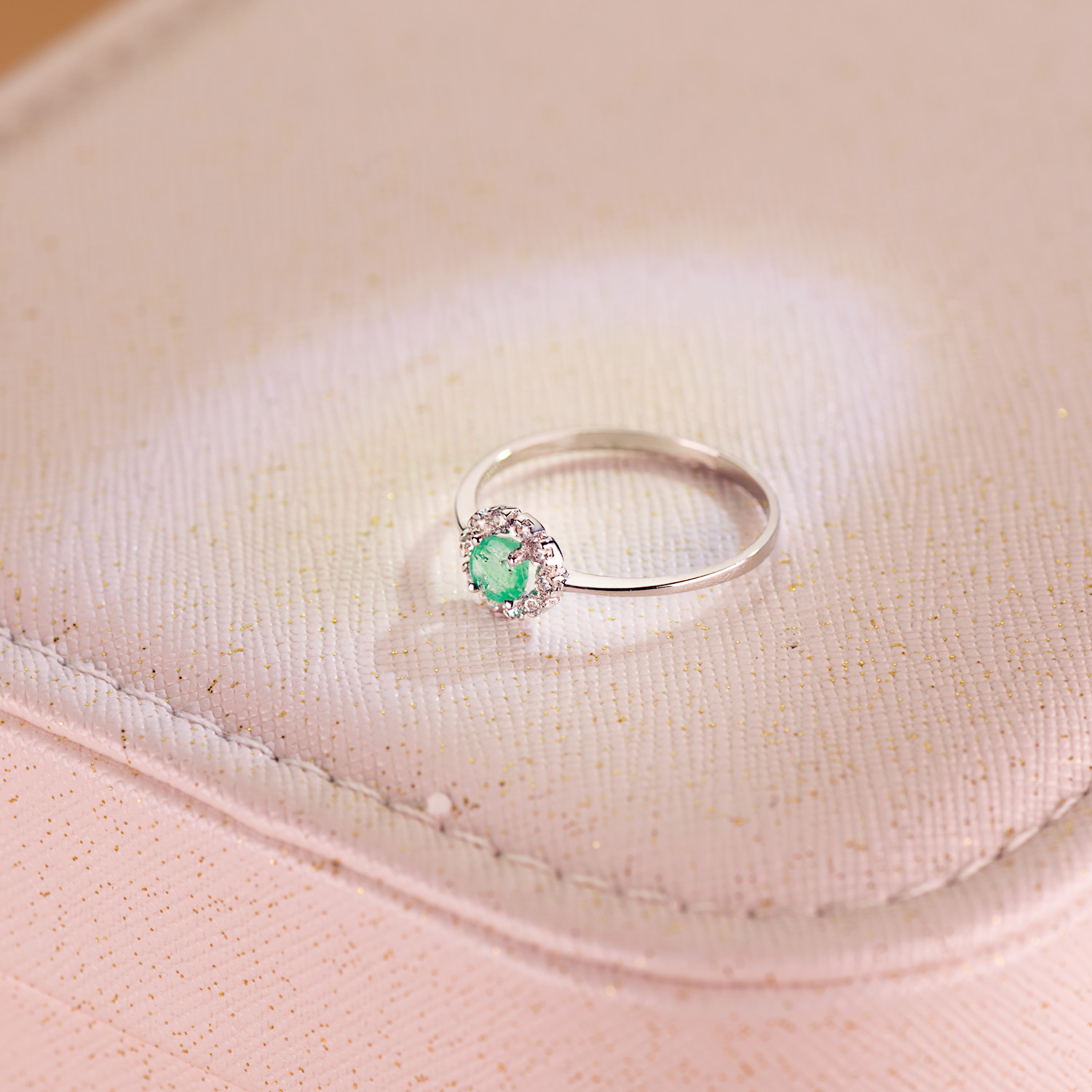 18K SORTIJA ORO BLANCO CON ESMERALDA 4MM Y 0,26 QTES Y CIRCONITAS, CUAJO 7 X 7 M