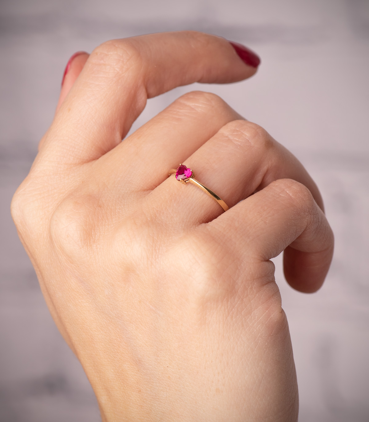 18K SORTIJA ORO AMARILLO CORINDON RECONSTRUIDO CORAZON RUBI 4X4 MM CON 4 GARRAS