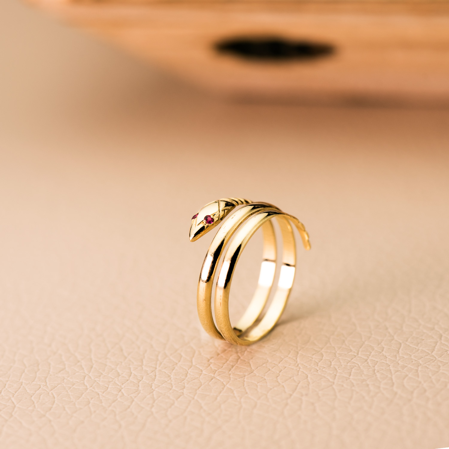 18K SORTIJA ORO AMARILLO SERPIENTE 4 VUELTAS CON OJO DE ESMERALDAS