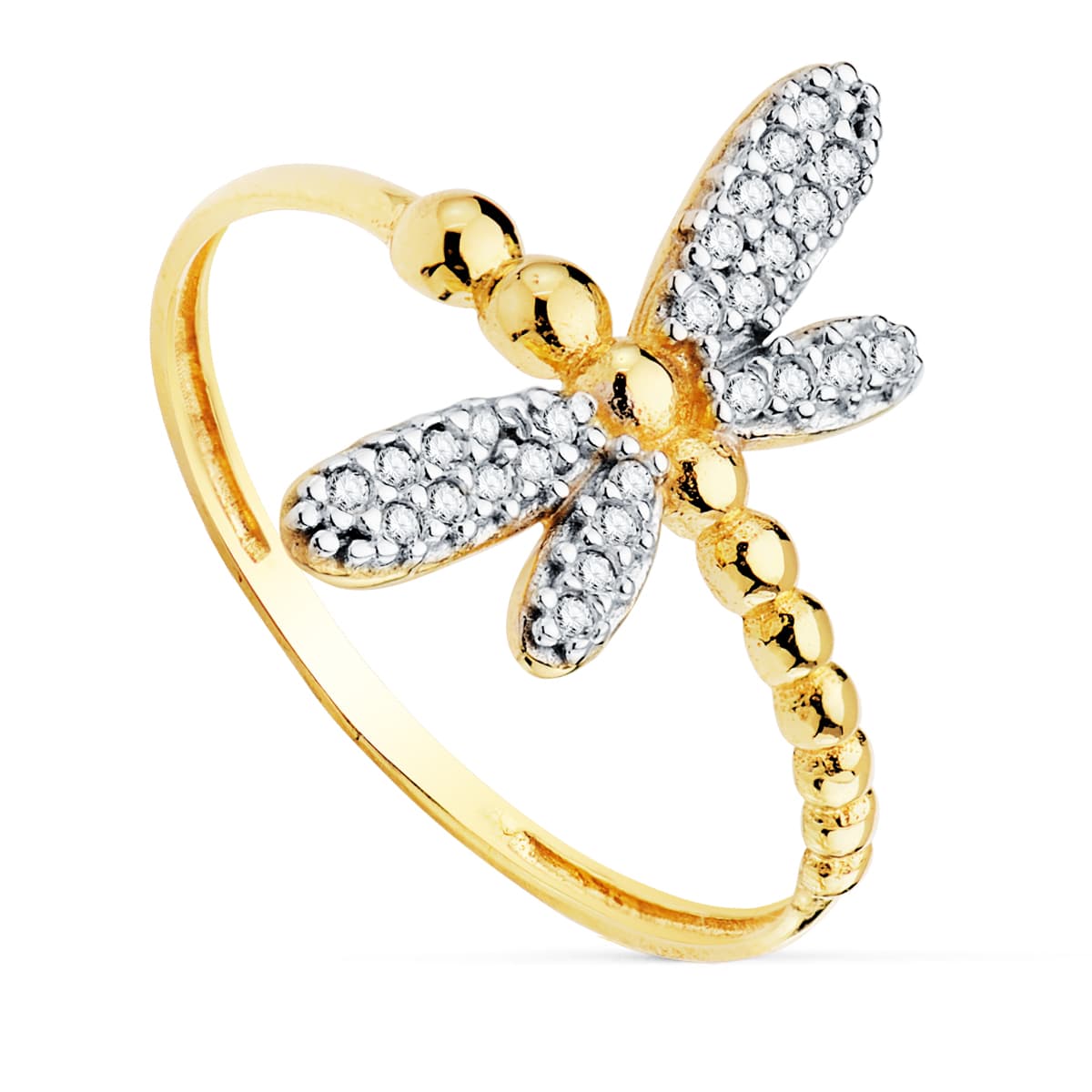 18K SORTIJA ORO BICOLOR CON LILIBELULA CUERPO DE BOLITAS Y ALAS DE CIRCONITAS, ANCHO: 17 MM