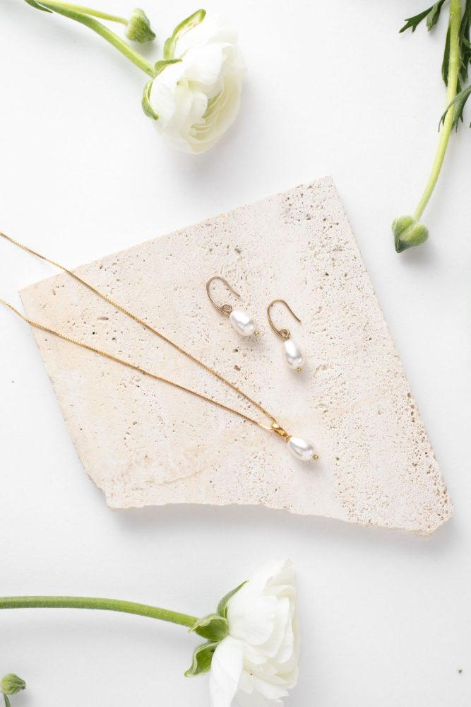 Los pendientes Julie son piezas refinadas pero llamativas con una sola gota de perla. Los pendientes Julie están disponibles con baño de rodio, oro de 14 quilates o oro rosa. Si está buscando un conjunto de joyería para novia, asegúrese de revisar también el collar Julie.