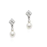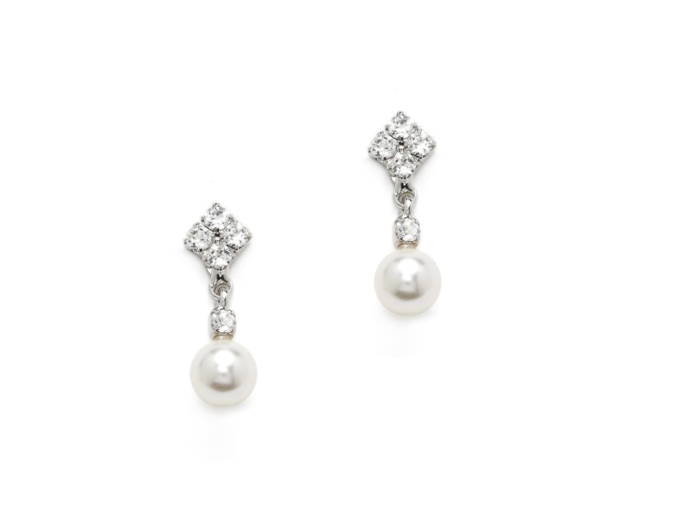 Los pendientes Romy son unos pendientes de novia sutiles pero elegantes con un encanto clásico. Este conjunto presenta perlas de Swarovski y delicados cristales en un engaste de plata 925. Debido a su pequeño tamaño y su aspecto sutil, los Pendientes Romy son fáciles de llevar y combinar con tu vestido de novia. Los aretes Romy están disponibles con baño de rodio, oro de 14k o oro rosa y combinan perfectamente con el collar Romy.