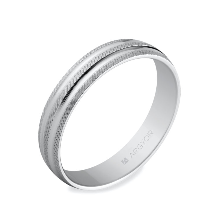 Alianza de plata de diseño Argyor 925/1000 referencia 5740037 y 4 mm de ancho. Esta joya tiene un acabado estriado mate y brillante y un interior plano.