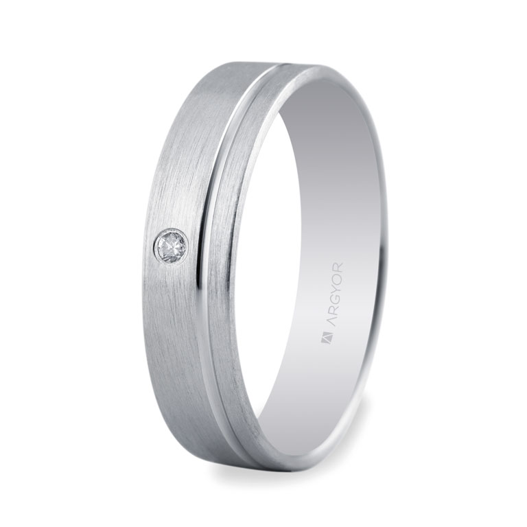 Alianza de boda en oro blanco rematada con un diamante de talla brillante. Acabado satinado plano ranurado por una línea en acabado pulido. Diamante: 0,02 ct, color H y pureza SI. Anchura: 5 milímetros. Interior confort. Referencia 555B1316.