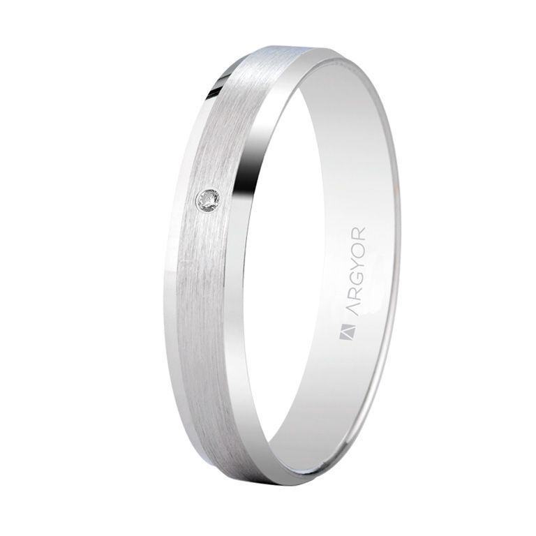 Alianza de diseño Argyor oro blanco de 18K referencia 5B40493D de 3,80 mm de ancho, perteneciente a la colección creaciones alianzas de boda de la marca. Esta joya tiene un acabado mate y brillante y un interior plano. Diamante talla brillante de 0.01ct color H, pureza SI.