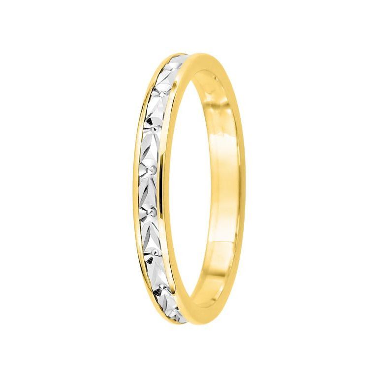 Esta alianza de boda de 2.5 milímetros destaca por su diseño bicolor y facetado, combinando elegancia clásica con un toque moderno.