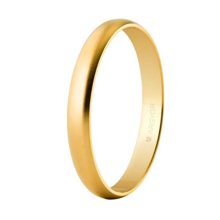 Alianza de boda clásica media caña de oro de 18K modelo 50305M de 3 mm de ancho. Cuenta con un acabado mate arena y un interior plano. A esta alianza se le puede añadir un diamante talla brillante de 0.02ct color H, pureza SI.