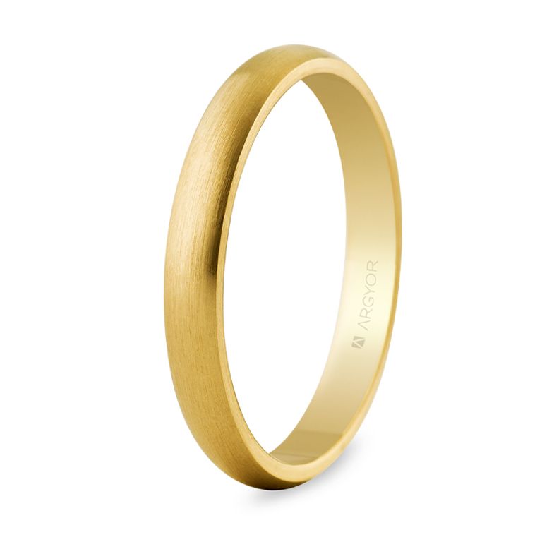 Alianza satinada en corte de media caña de 3mm. Unas finas líneas verticales crean un suave pulido sobre esta joya hecha en oro de 750 milésimas (18 quilates). Anchura: 3 milímetros. Interior plano. Referencia: 50306S. A esta alianza se le puede añadir un diamante talla brillante de 0.02ct color H, pureza SI.