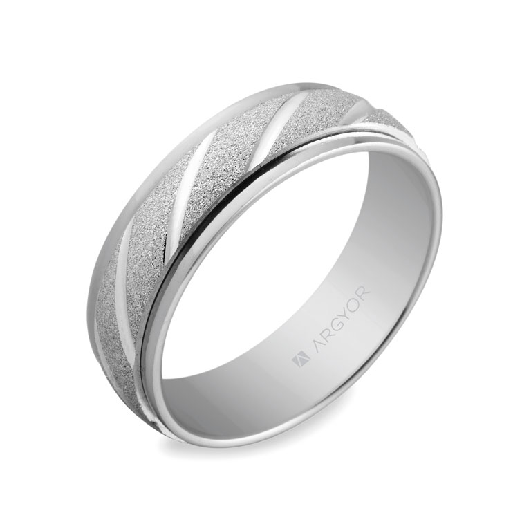 Alianza de boda de 6 milímetros de anchura realizada en plata 925/1000 con baño de rodio. Su acabado principal, en su banda central, es un delicado matizado ‘arena’ cruzado por diagonales en acabado brillo. Las bandas laterales también tienen acabado pulido en brillo.