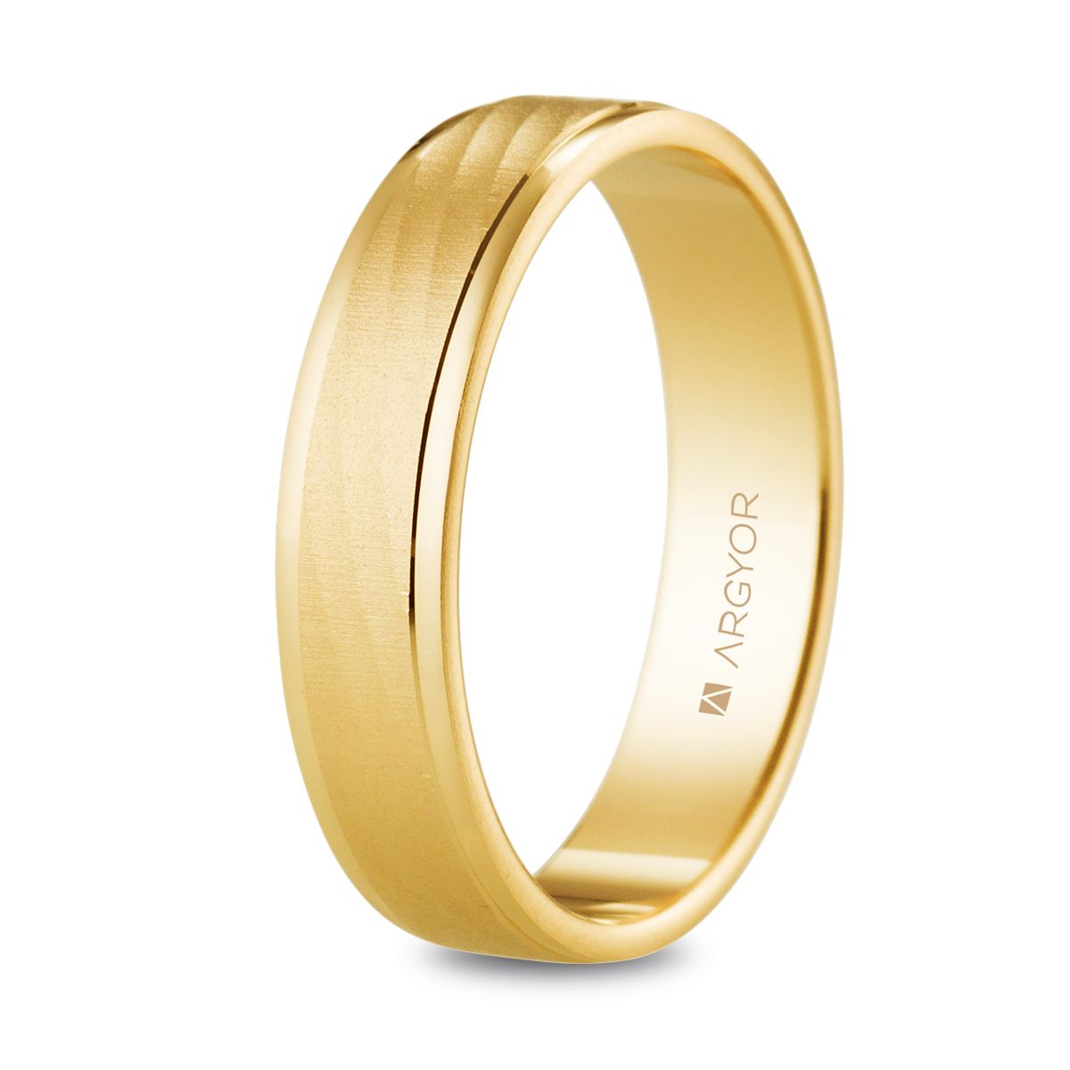 Alianza de oro amarillo de 18k. Alianza plana combinado texturizado con biseles en brillo. Anchura de la alianza 4.5mm. Interior plano.