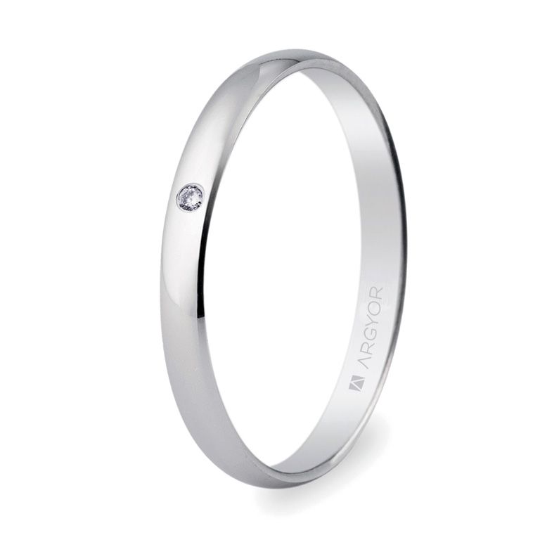 Alianza de boda media caña Argyor clásica de oro blanco de 18K y 2,5 milímetros de anchura. Cuenta con un diamante engastado y un interior plano. El diamante es de talla brillante y 0,01 kilates, color H y pureza SI.