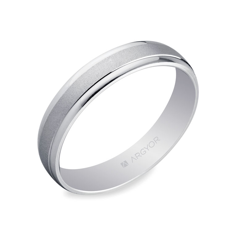 Alianza de boda de oro blanco de 18kt cuyo sencillo diseño consiste en una banda central mate sobre un acabado brillo visible en los laterales. Anchura: 4 milímetros. Interior plano. A esta alianza se le puede añadir un diamante talla brillante de 0.02ct color H, pureza SI. Solicitela con la referencia 5B40044D