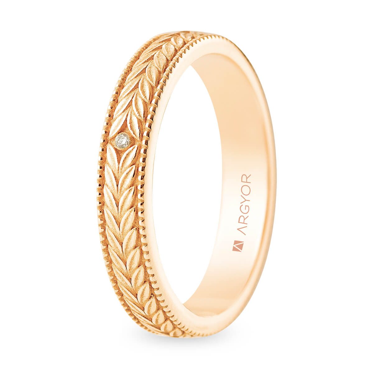 Alianza oro rosa de 18lk de 3.0mm. Acabado brillo. Dise��o de floral. 1 diamante talla brillante de 0.