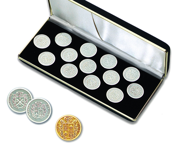 Arras con el escudo heráldico de los novios y fecha del enlace ( anverso y reverso).