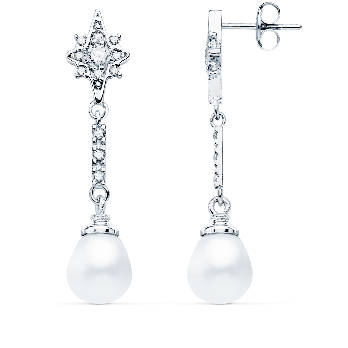 18K PENDIENTES LARGOS ORO BLANCO PERLA Y CIRCONITA 36X8 MM CIERRE PRESION