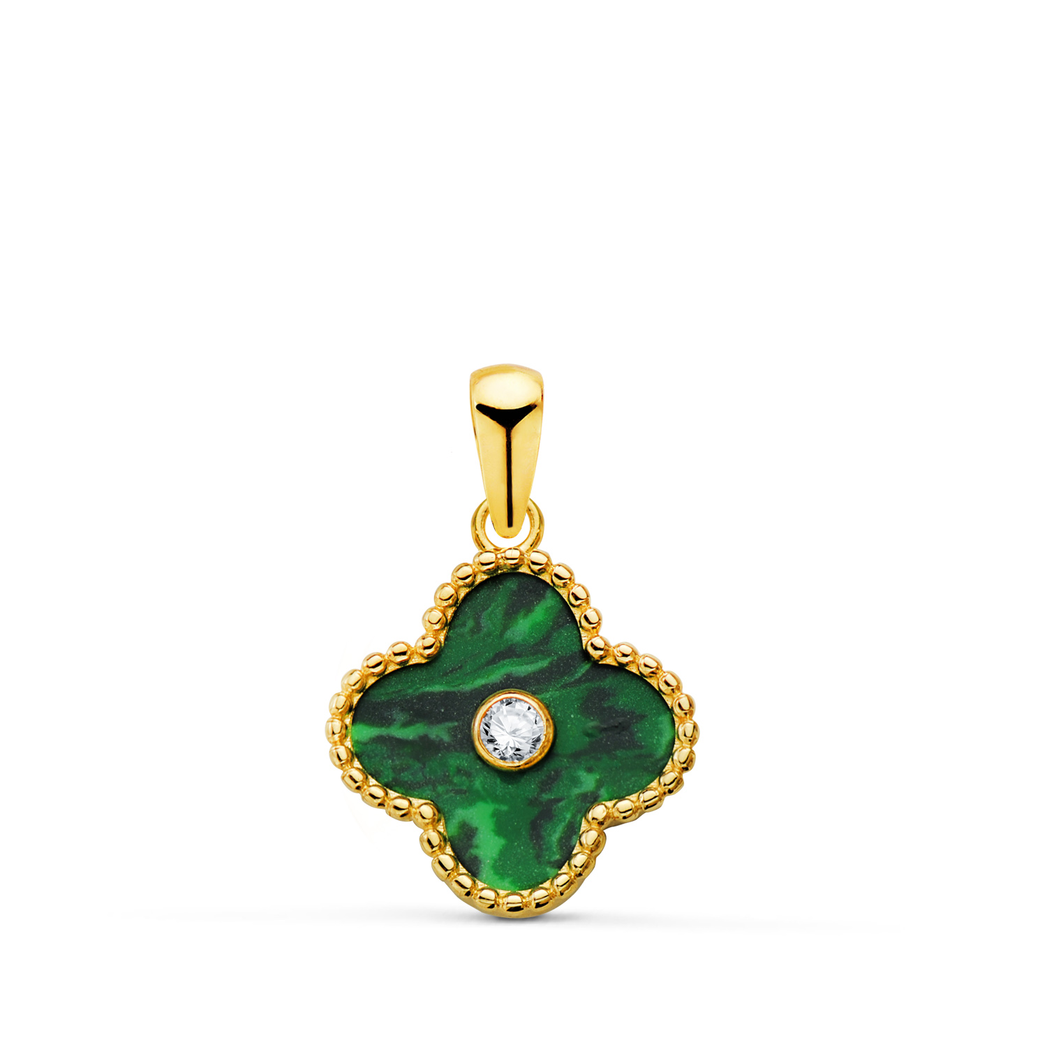 18K COLGANTE ORO AMARILLO TREBOL CERCO BOLITAS Y MALAQUITA CON CIRCONITA 12,5X12,5 MM,