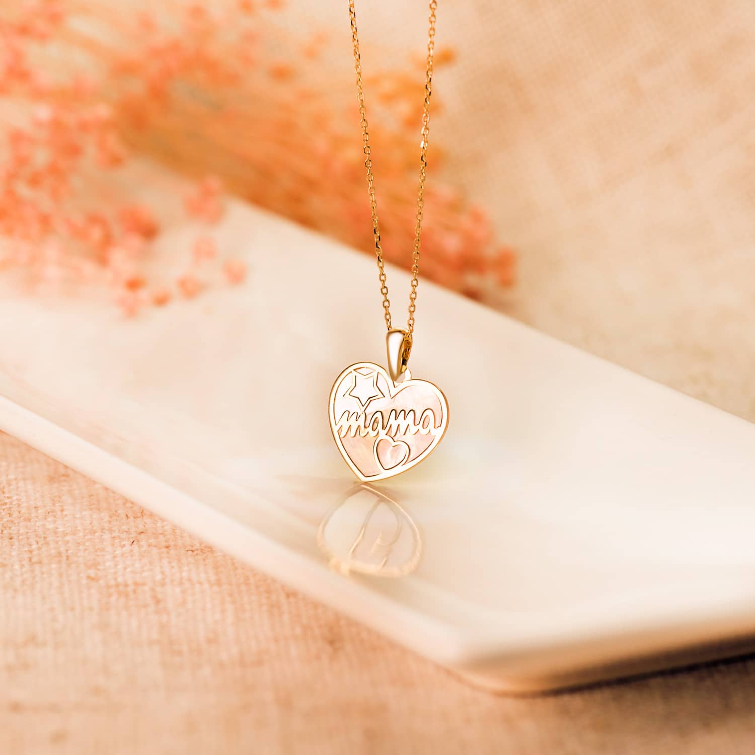 18K COLGANTE CORAZON ORO AMARILLO CON NACAR MAMA Y DIBUJO DE ESTRELLA Y CORAZON 16X14MM