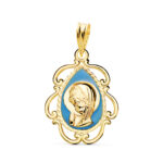 18K MEDALLA ORO AMARILLO VIRGEN NIÑA ESMALTE AZUL Y CERCO CALADO EN BRILLO 22X16 MM