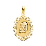 18K MEDALLA ORO AMARILLO VIRGEN NIÑA PERFIL CERCO CALADO BRILLO, 23 X 16 MM