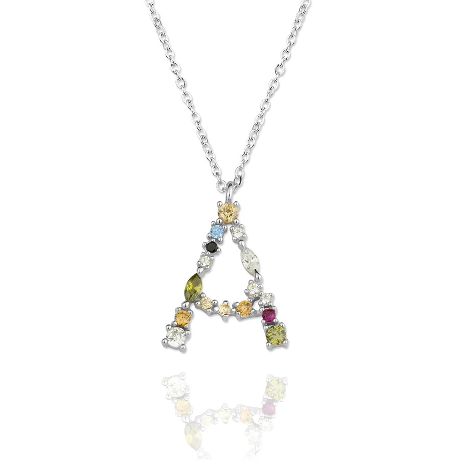 Gargantilla Inicial «A» con circonitas plata de ley 925mm, con una altura de inicial de 17mm y un largo de cadena que va desde los 40 a 45 cm.