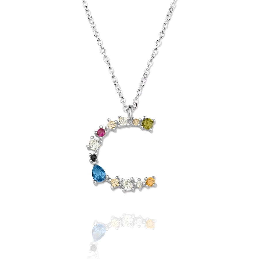 Gargantilla Inicial «C» con circonitas plata de ley 925mm, con una altura de inicial de 17mm y un largo de cadena que va desde los 40 a 45 cm.