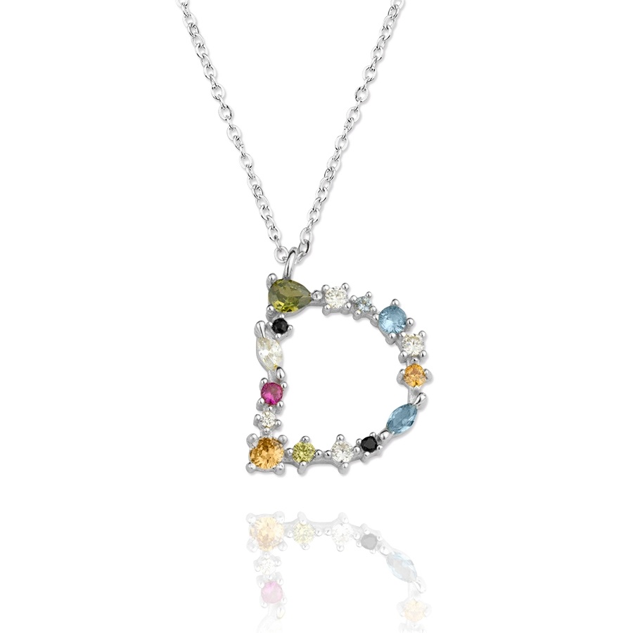 Gargantilla Inicial «D» con circonitas plata de ley 925mm, con una altura de inicial de 17mm y un largo de cadena que va desde los 40 a 45 cm.