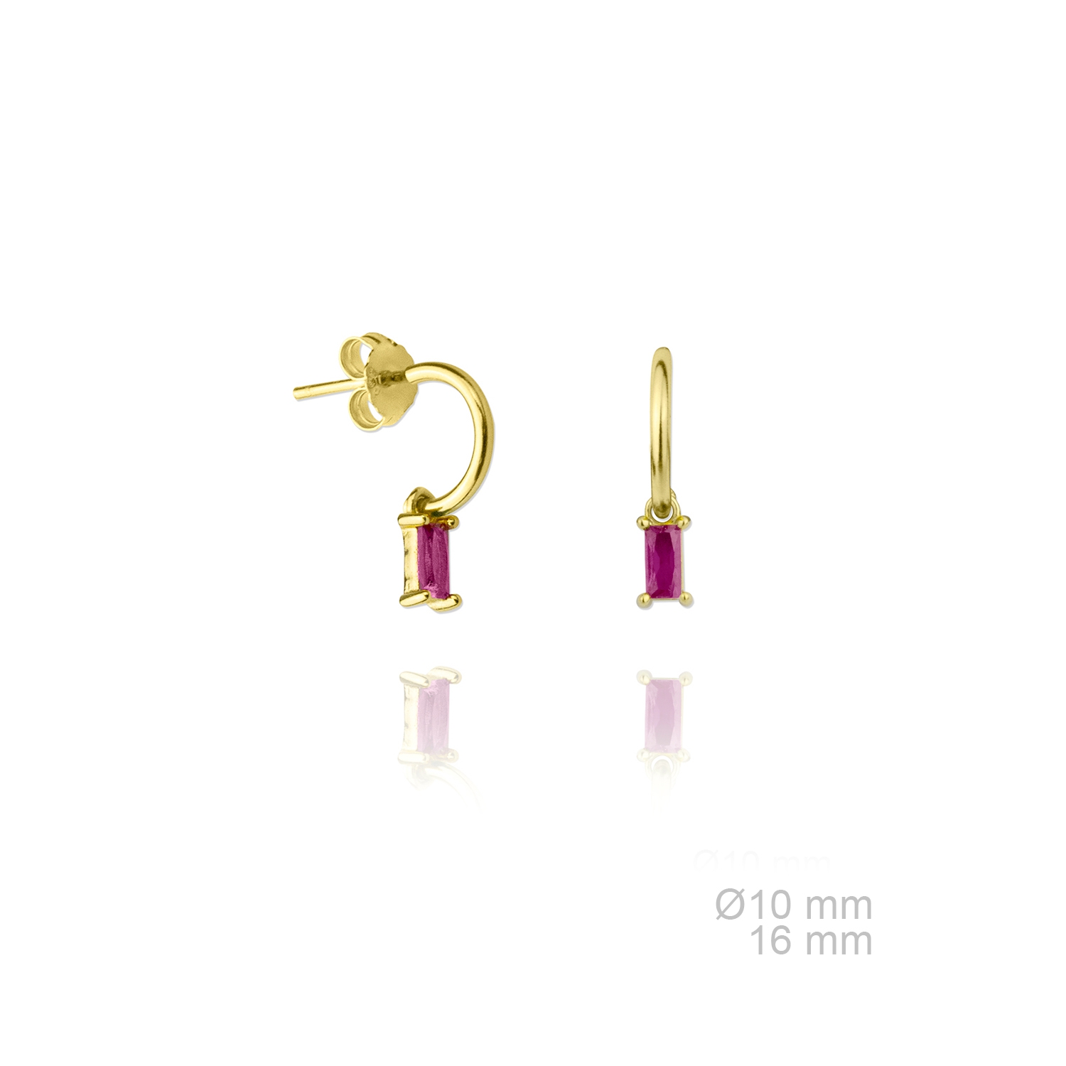 Pendiente de plata medio aro con colgante de zirconita de color en forma rectangular. Terminació chapado oro.