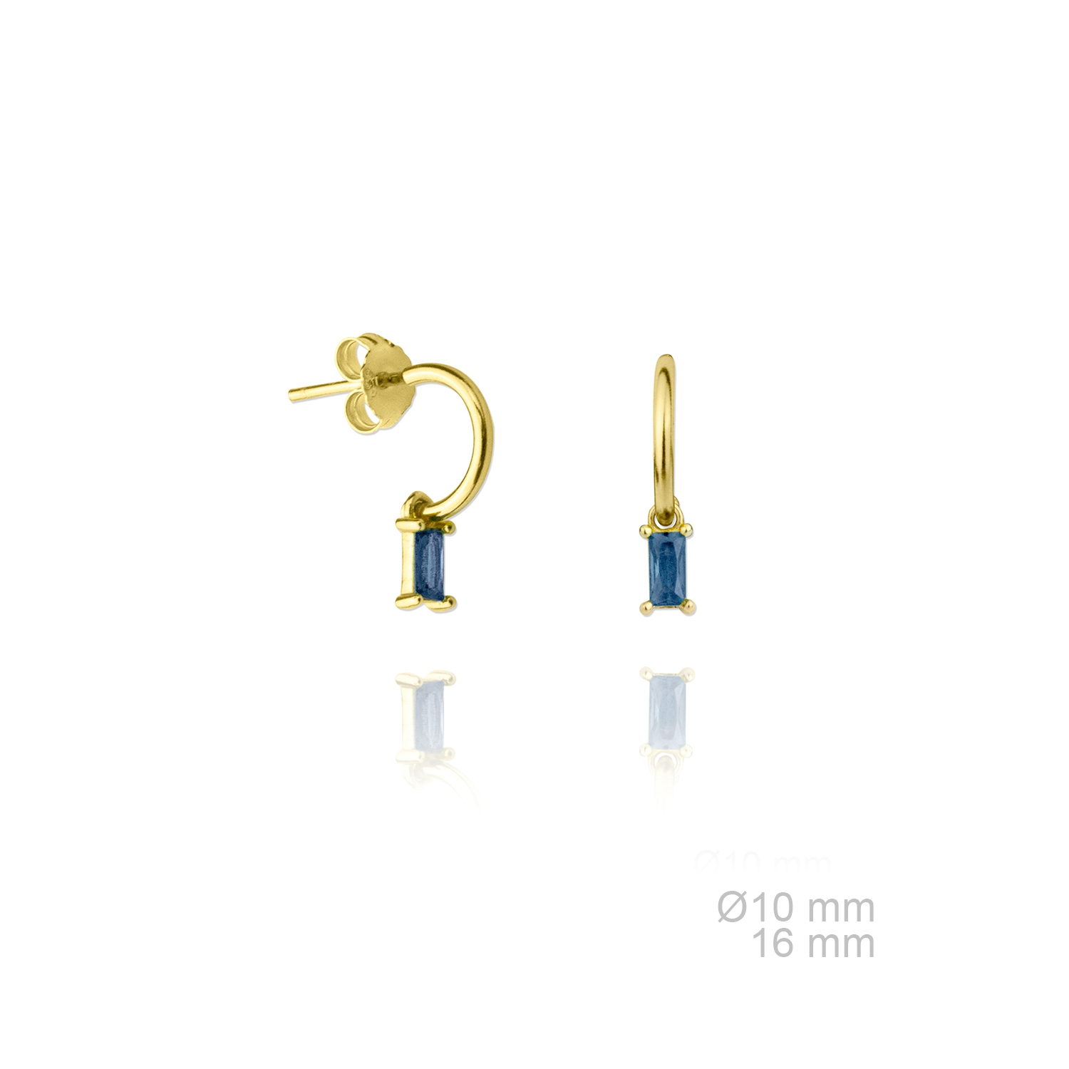 Pendiente de plata medio aro con colgante de zirconita de color en forma rectangular. Terminació chapado oro.