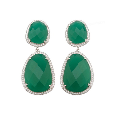 Pendiente realizado en dos partes, con piedras verdes sinteticas y orla de zirconitas.