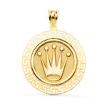 18K MEDALLA ORO AMARILLO CORONA CON BORDE DE GRECA CALADA, 27 MM