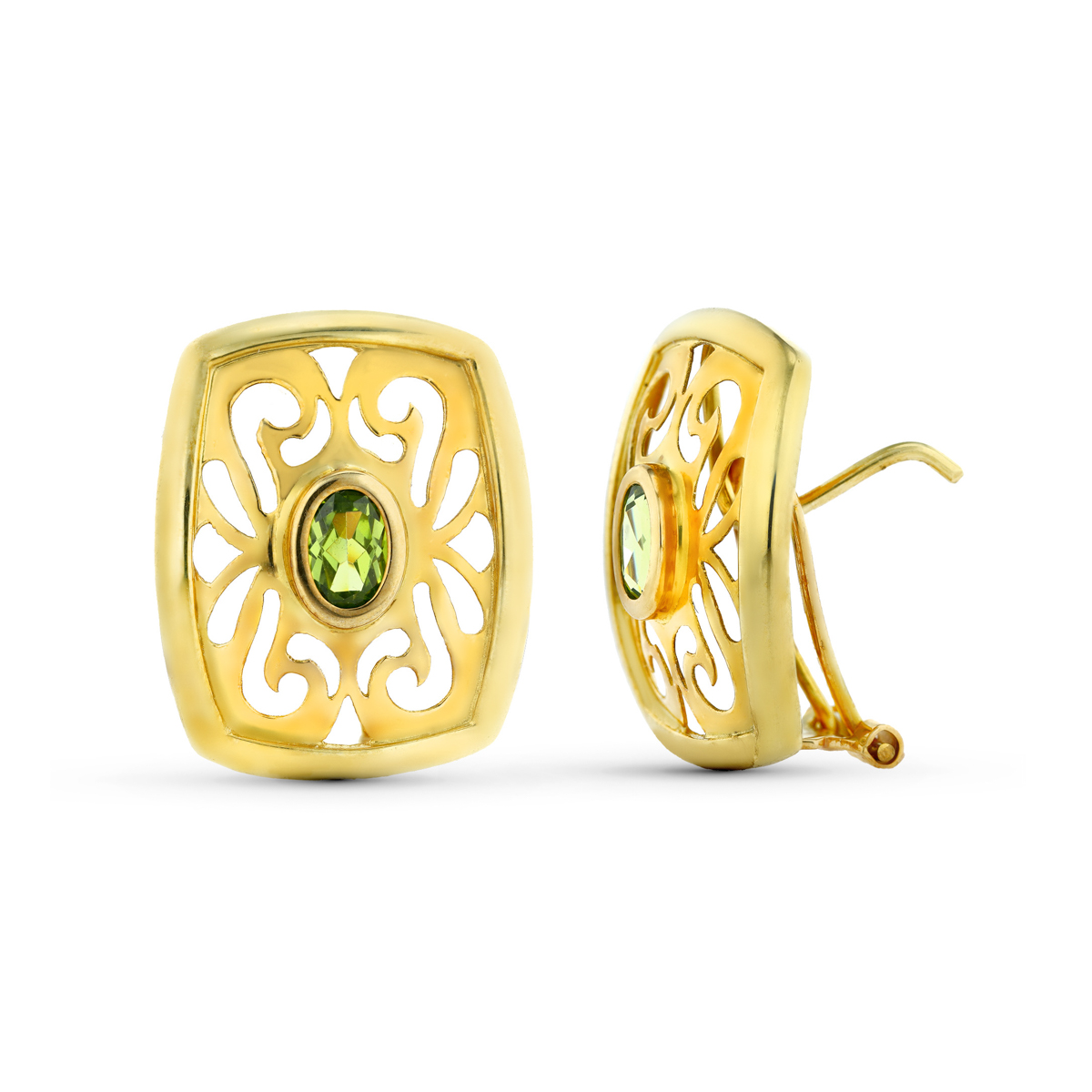 18K PENDIENTES ORO AMARILLO CALADOS CON OLIVINA, CIERRE OMEGA