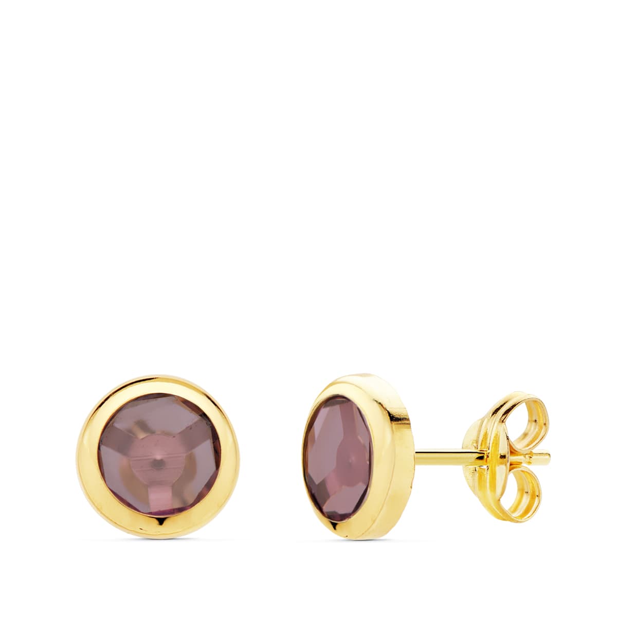 18K PENDIENTES ORO AMARILLO CHATON PIEDRA AMATISTA 6,5 MM CIERRE PRESION