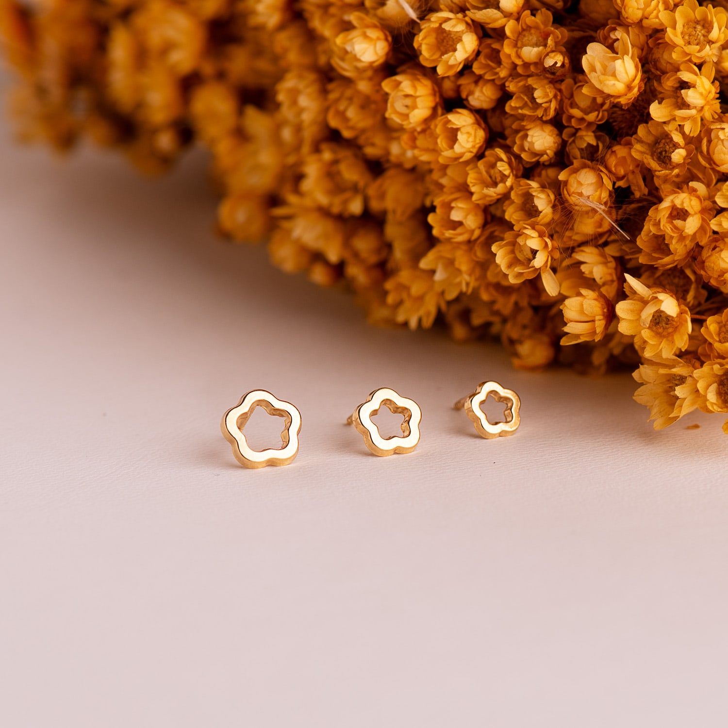 18K PENDIENTES ORO AMARILLO FLOR BRILLO CALADA 5 X 5 MM, CIERRE TUERCA