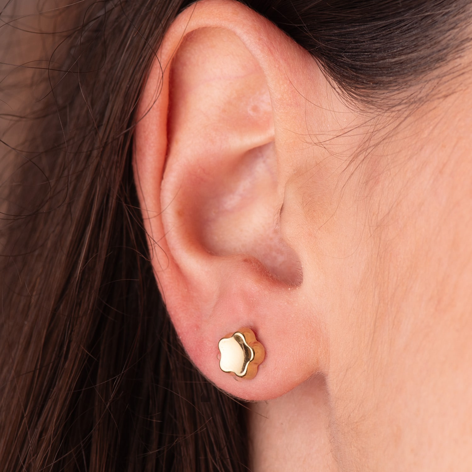 18K PENDIENTES ORO AMARILLO FLOR CONCAVO EN BRILLO 7,5X7,5 MM, CIERRE PRESION