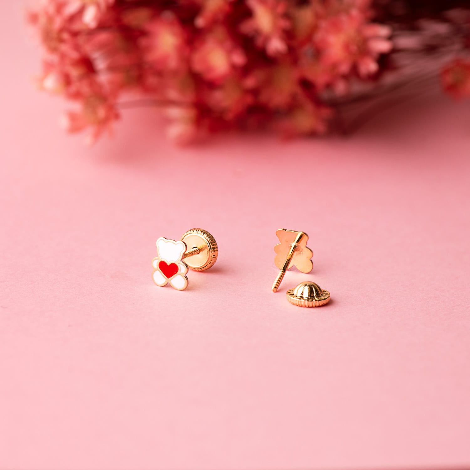 18K PENDIENTES ORO AMARILLO OSO ESMALTE BLANCO Y CORAZON, 6 X 4,5 MM, CIERRE TUERCA