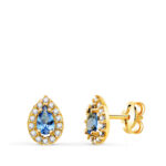 18K PENDIENTES ORO AMARILLO PIEDRA GOTA AZUL Y CIRCONITAS, 8,5 X 6 MM, CIERRE PRESION