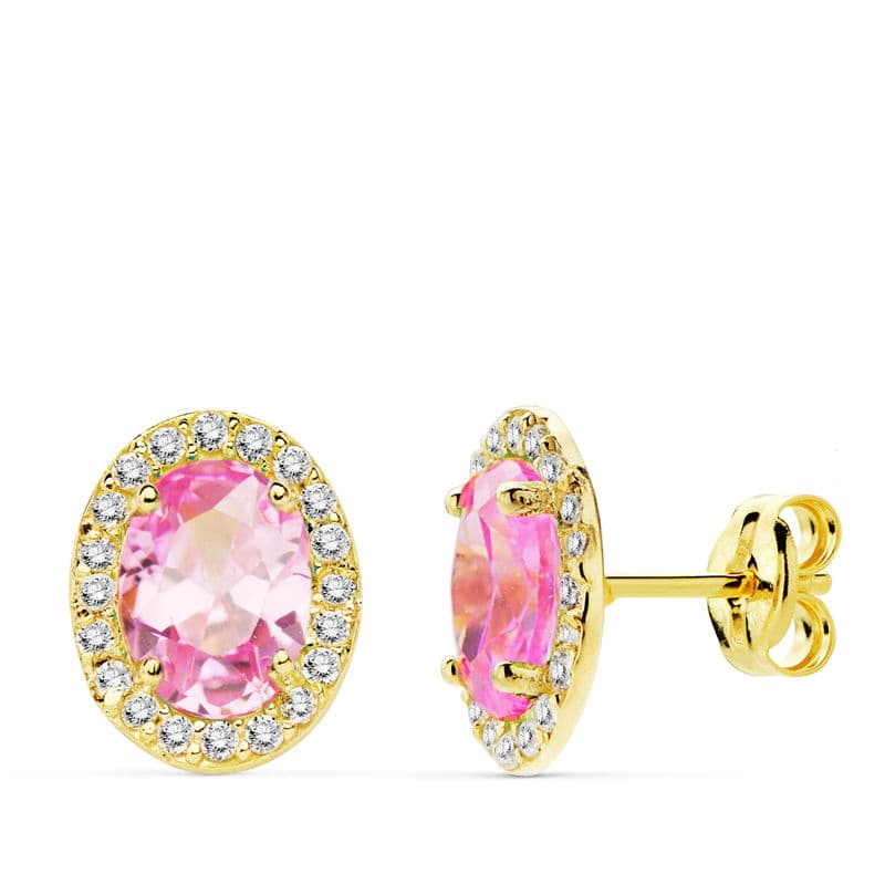 18K PENDIENTES ORO AMARILLO PIEDRA ROSA OVAL CIRCONITA 10X8 MM CIERRE PRESION