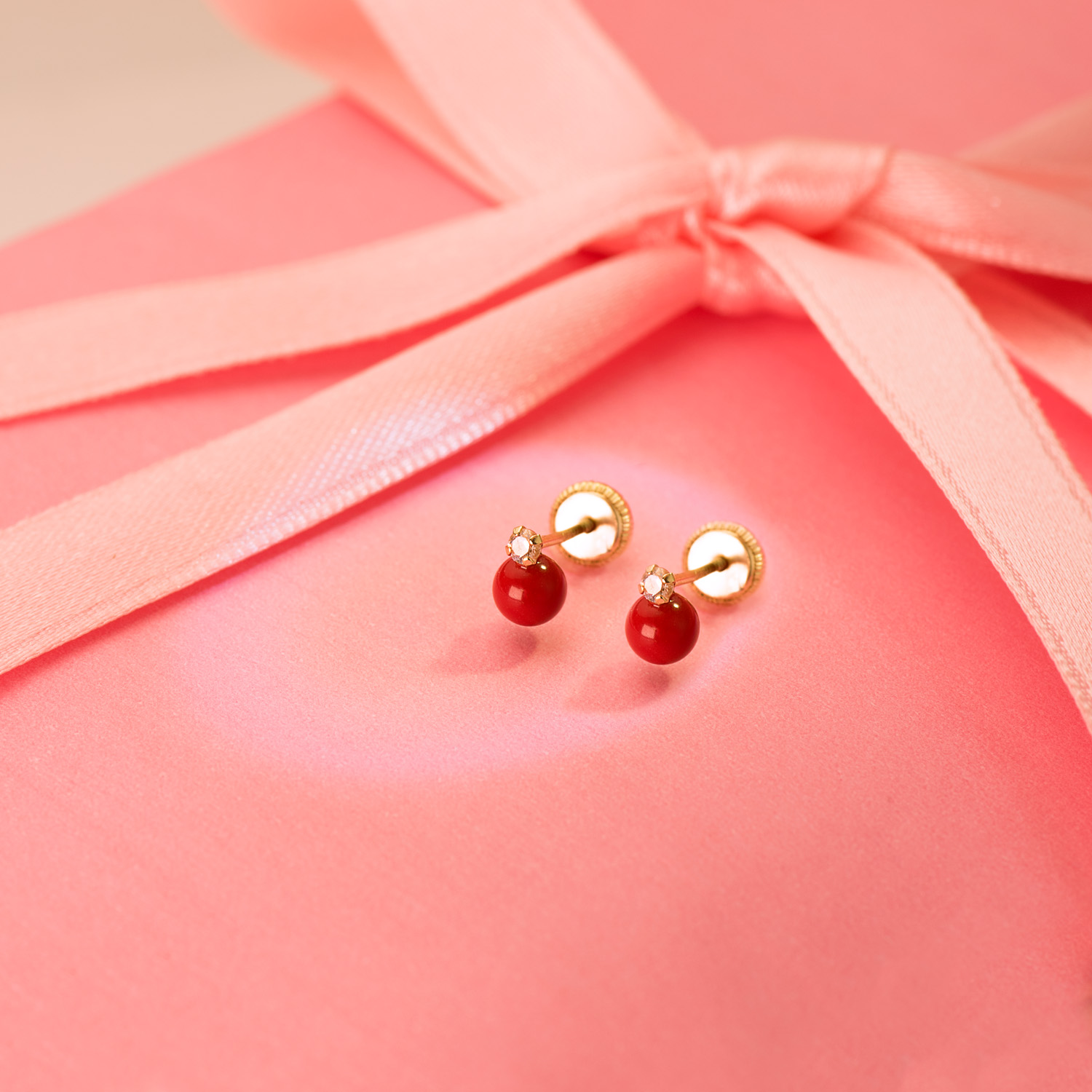 18K PENDIENTES ORO AMARILLO TU Y YO CORAL Y CIRCONITA 6,5 X 4 MM, CIERRE TUERCA