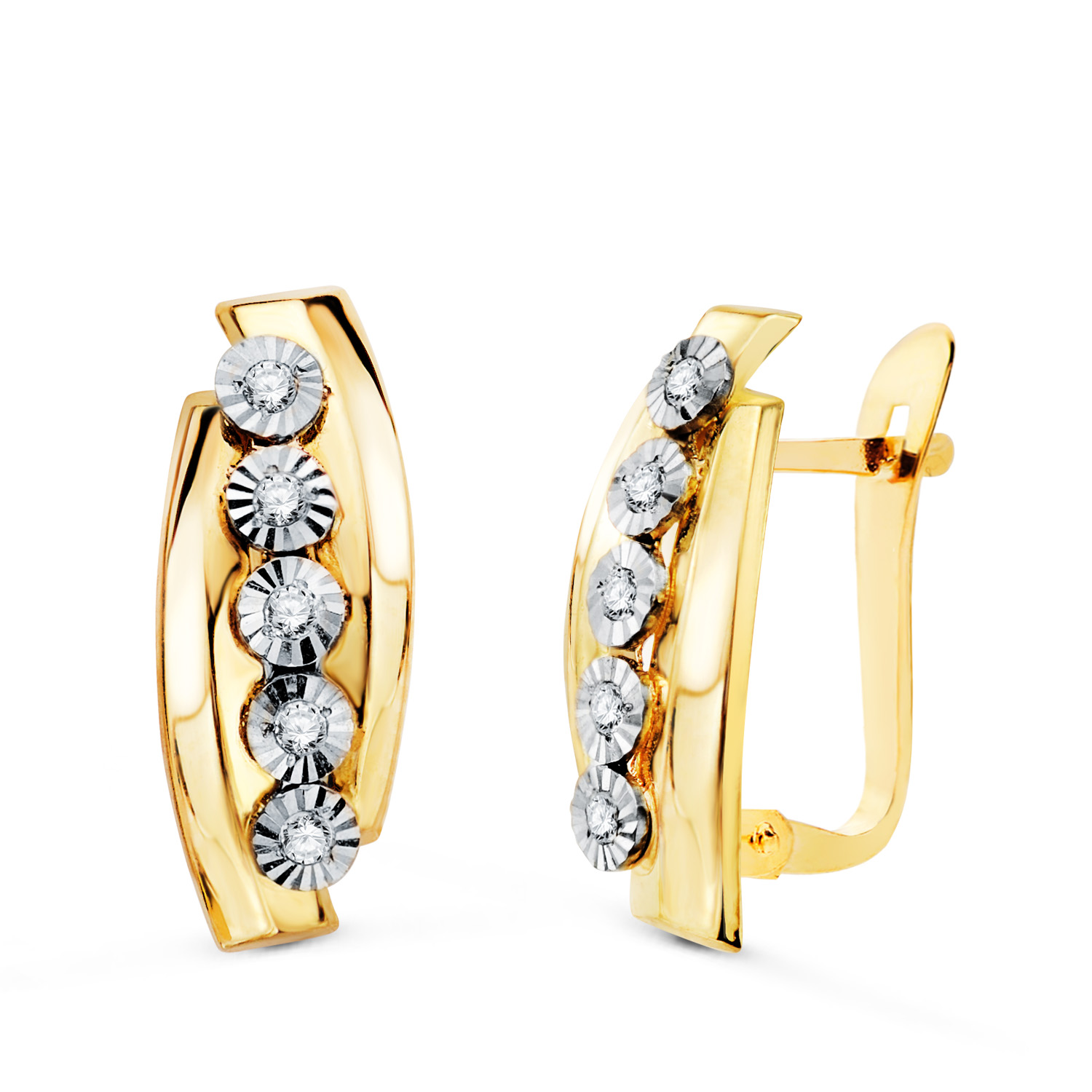 18K PENDIENTES ORO BICOLOR BANDAS CON MOTIVOS REDONDOS TALLADOS, 16 X 6 MM, CIERRE CATALAN