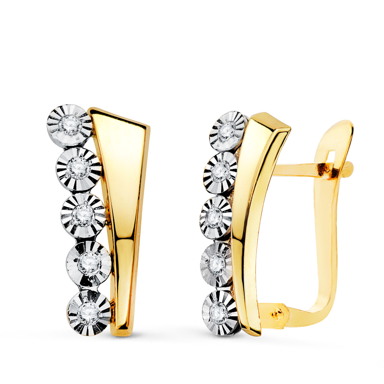 18K PENDIENTES ORO BICOLOR BANDAS Y MOTIVOS REDONDOS TALLADOS, 14 X 6 MM, CIERRE CATALAN
