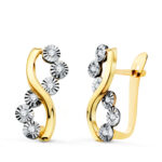 18K PENDIENTES ORO BICOLOR BANDAS Y MOTIVOS REDONDOS TALLADOS, 14 X 6,5 MM, CIERRE CATALAN