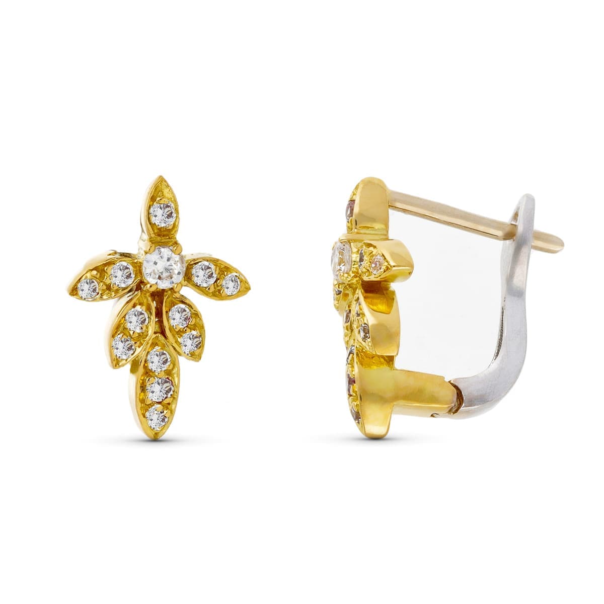 18K PENDIENTES ORO BICOLOR HOJITAS CIRCONITA CIERRE CATALAN