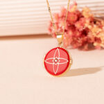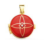 18K PORTAFOTOS COLGANTE ORO AMARILLO GUARDAPELO DIJE REDONDO ESMALTE ROJO DIAMANTE 0,035 QTES, 21 MM