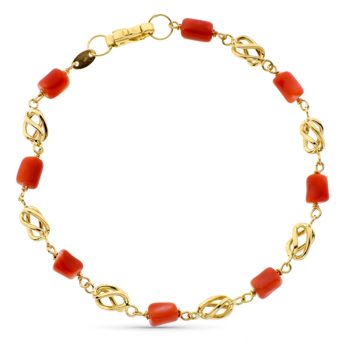 18K PULSERA ORO AMARILLO CON JAULAS Y CORAL FINO JAPONES 19CM