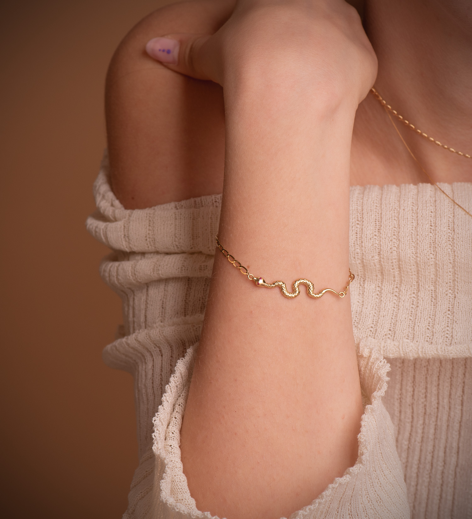 18K PULSERA ORO AMARILLO SERPIENTE OJOS RUBI 40 MM, CADENA HUECA, LARGO: 19CM