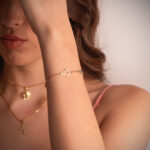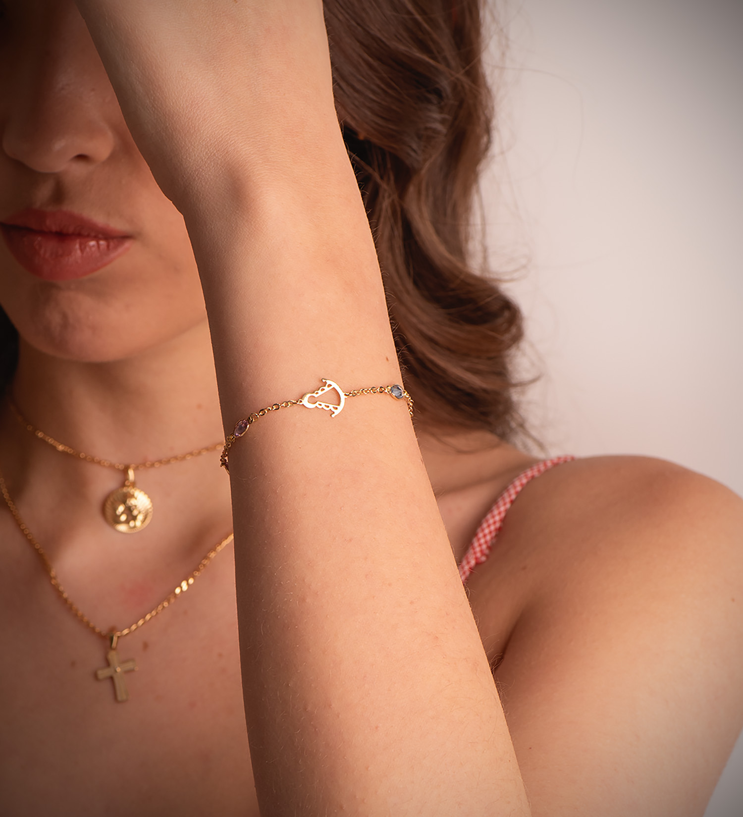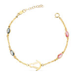 18K PULSERA ORO AMARILLO SILUETA VIRGEN ROCIO 14X11 MM CON CIRCONITAS ROSAS Y AZULES, LARGO: 15 3 CM