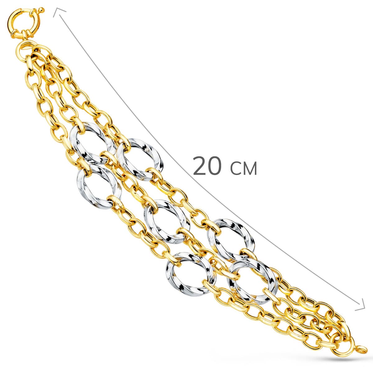 18K PULSERA ORO BICOLOR TRIPLE CADENA HUECA MOTIVOS REDONDOS 20CM