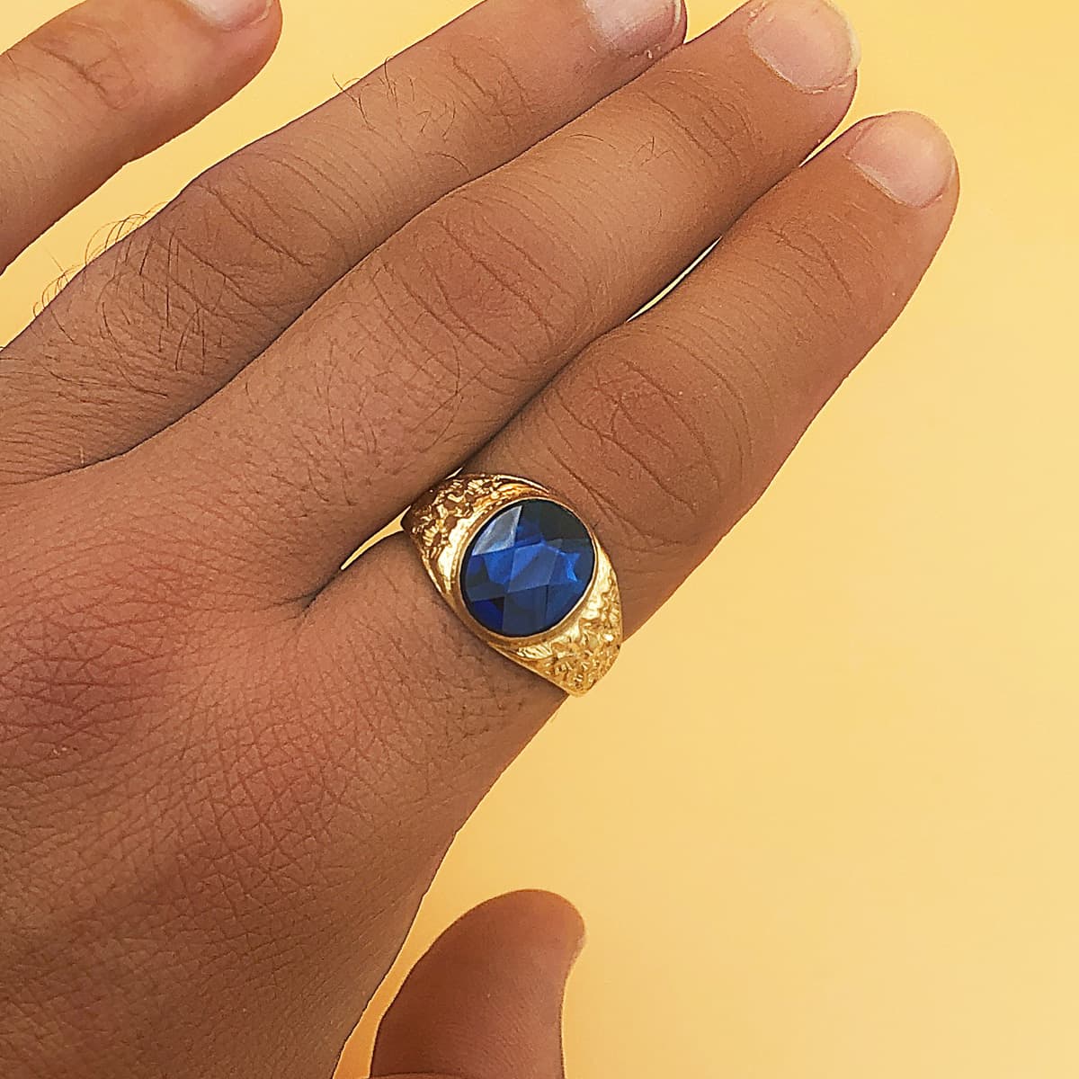18K SELLO CABALLERO TALLADO ORO AMARILLO MACIZO PIEDRA SPINEL ZAFIRO AZUL OVAL 12 X10 MM