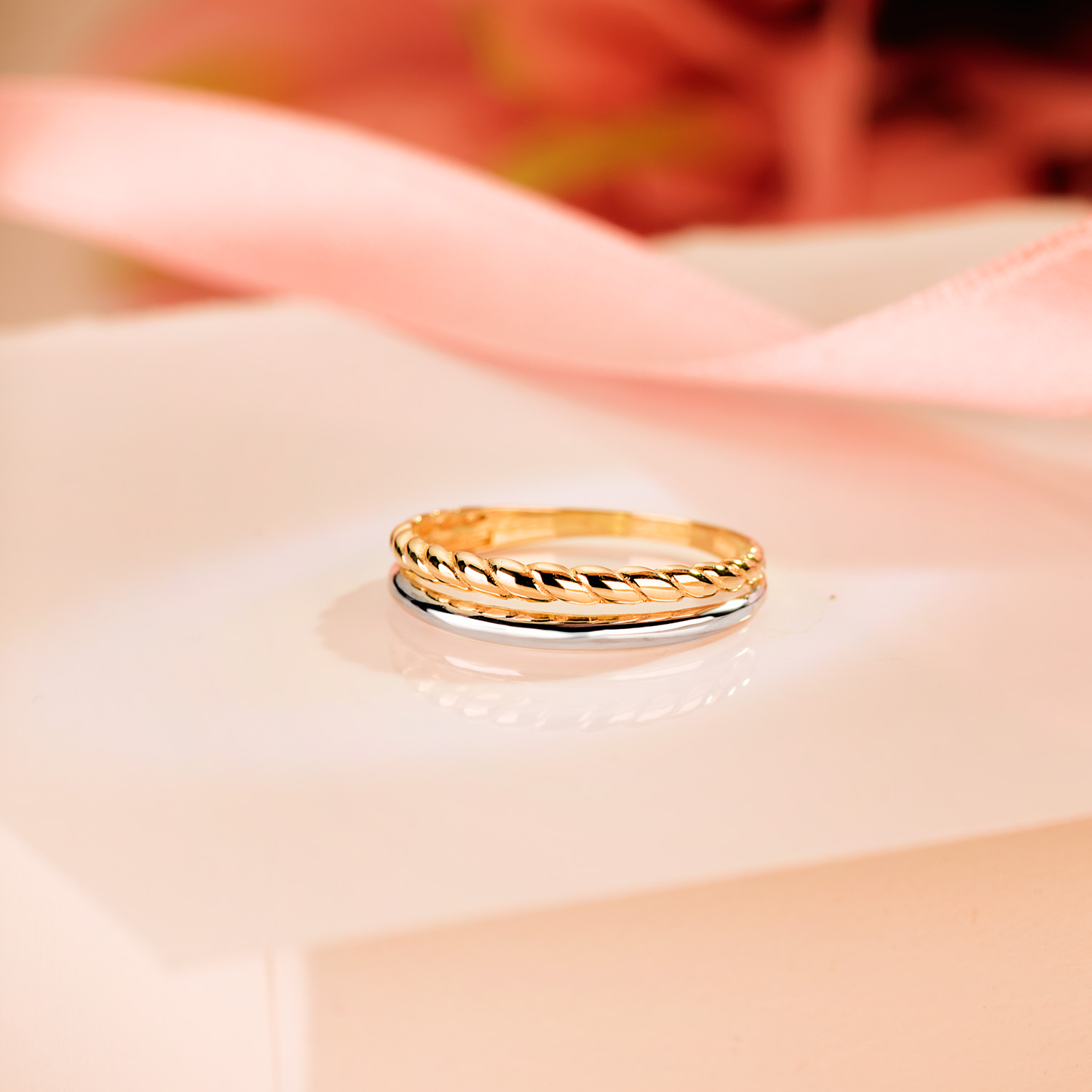 18K SORTIJA ORO BICOLOR DOBLE BANDA LISA Y RELIADA, ANCHO: 4MM