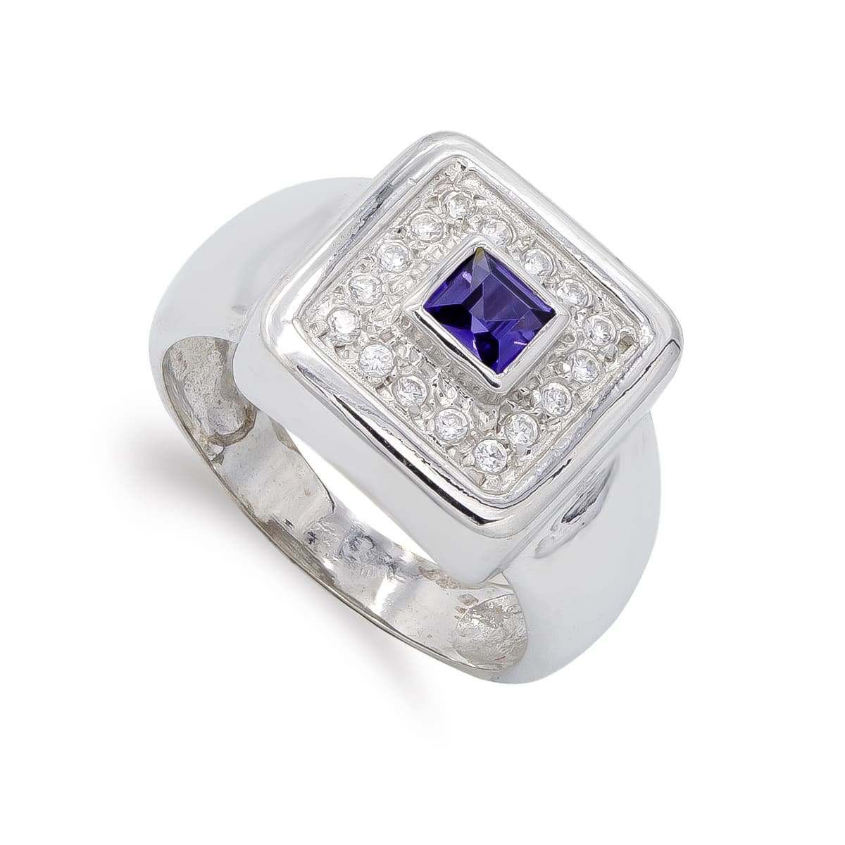 18K SORTIJA ORO BLANCO CON CIRCONITA Y AMATISTA, MOTIVO CUADRADO: 14X14 MM